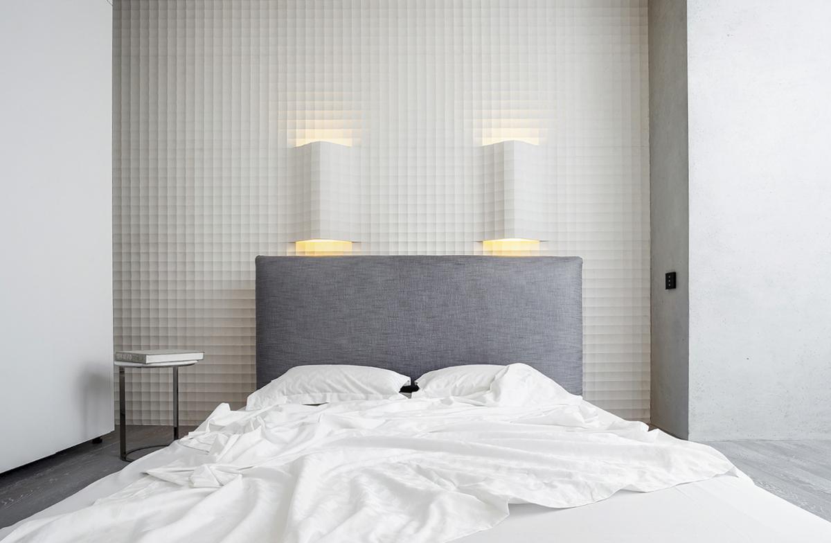 на фото: 3D панелі в дизайні гостьової спальні дворівневої квартири площею 200 кв.м, м. Київ, Оболонська набережна 1-а (автори: Олена Романюк, Микита Борисенко)